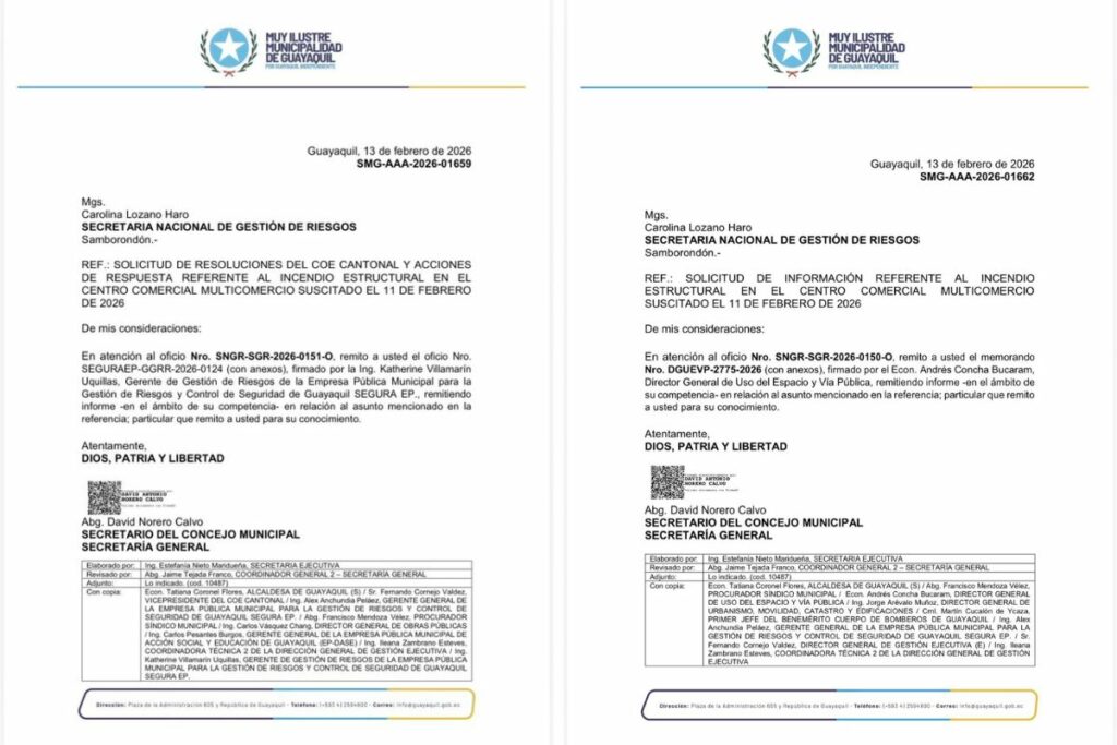 En atención a la solicitud nacional, la Municipalidad de Guayaquil informó que dispuso con carácter de alta prioridad la remisión de la documentación técnica el pasado 13 de febrero de 2026. A través de la Secretaría General del Concejo, se canalizaron los informes elaborados por las direcciones municipales competentes y la empresa pública Segura EP.